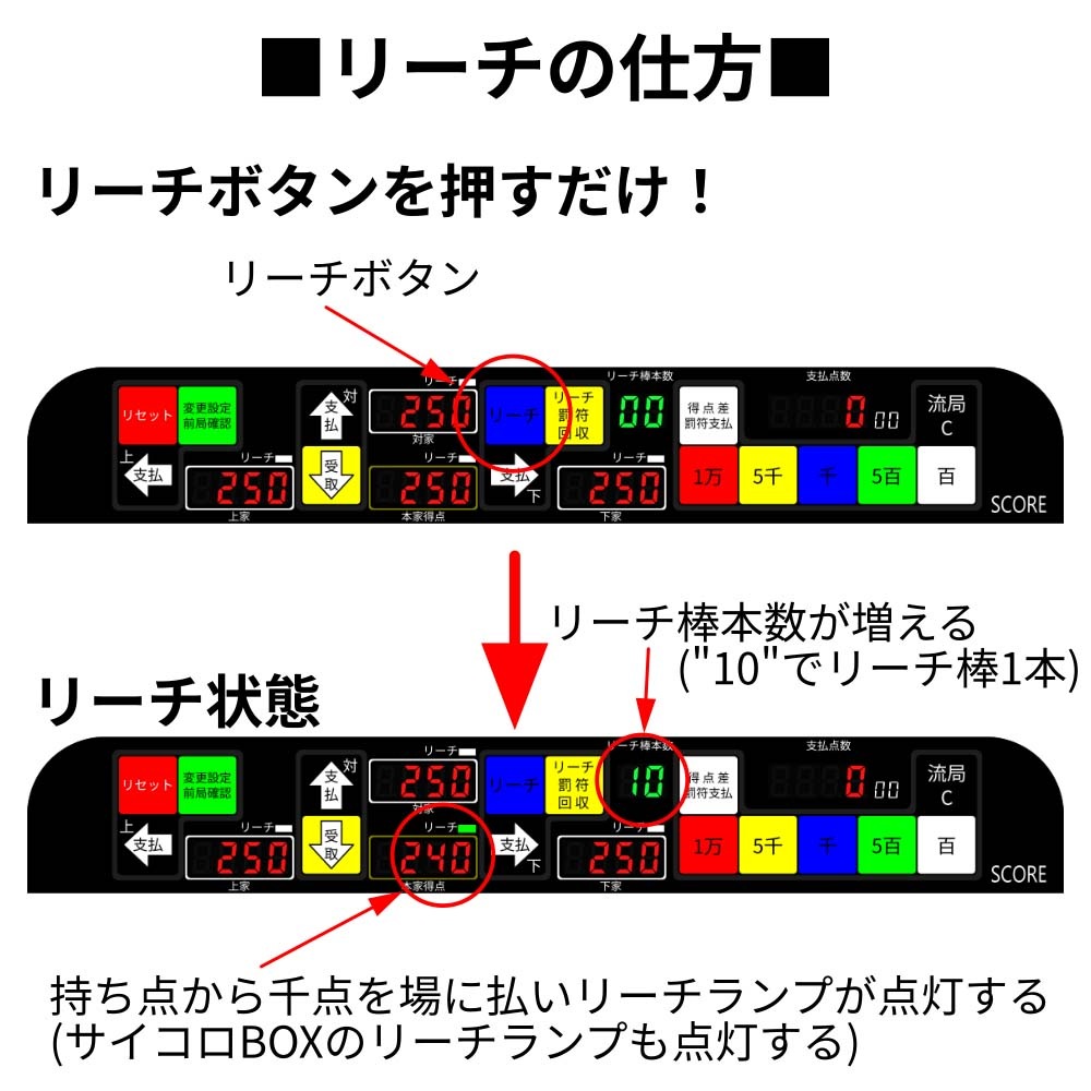 持ち点から千点を場に支払いリーチランプが点灯し、供託リーチ棒本数が増える。