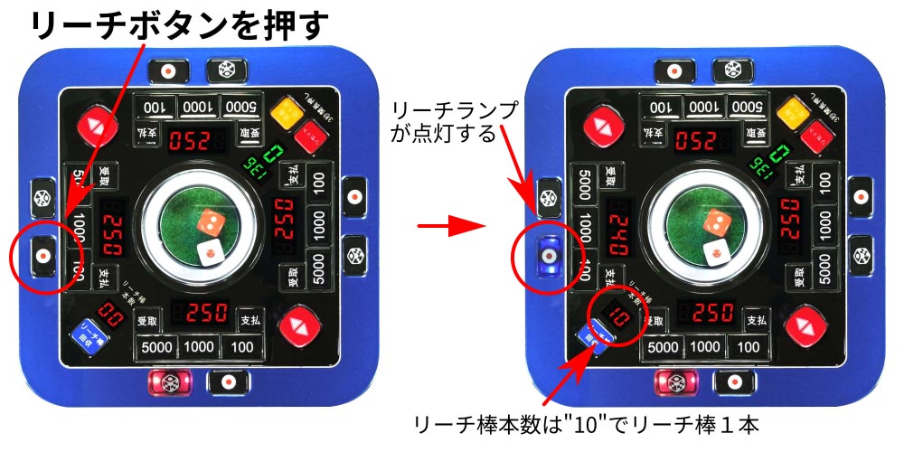 持ち点から千点を場に支払いリーチランプが点灯し、供託リーチ棒本数が増える。